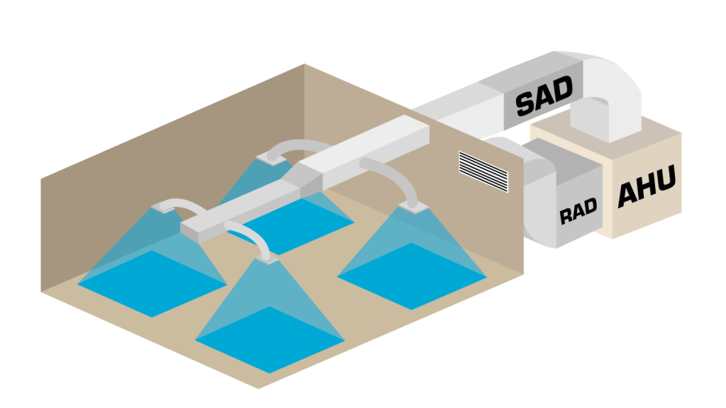 Kombinasi yang dirancang khusus dari berbagai elemen distribusi menghasilkan aliran udara yang merata dan sesuai kebutuhan di seluruh area